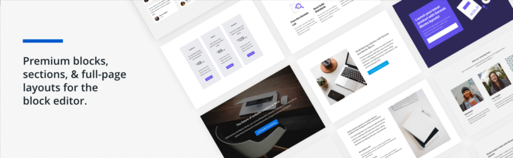 • Specialized blocks for your industry (e.g., e-commerce, portfolio)