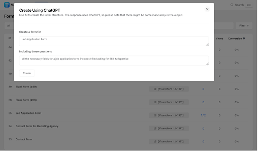 Great news! You can create smart and creative forms only by giving prompts to ChatGPT. Fluent Forms (trusted by 500k+ businesses worldwide) has brought this impressive ChatGPT integration that allows you to create forms using prompts. You can always manually refine and polish the ChatGPT form.