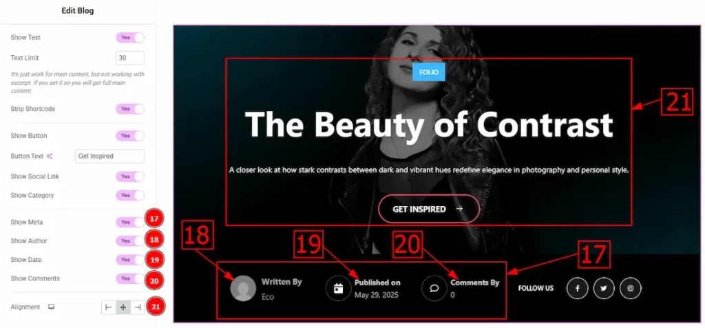 21. Alignment: This option allows you to set the content position to left, center or right.