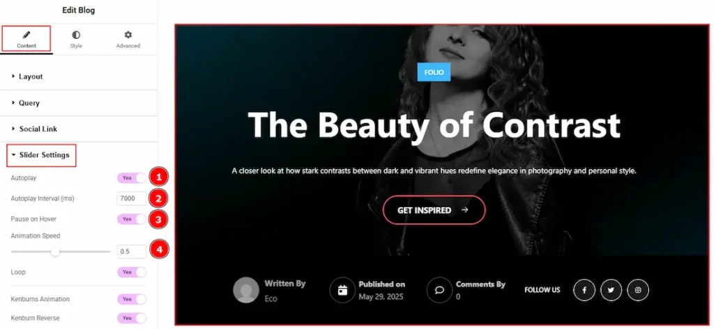 2. Autoplay Interval (ms): This option lets you set the time delay between each slide transition.