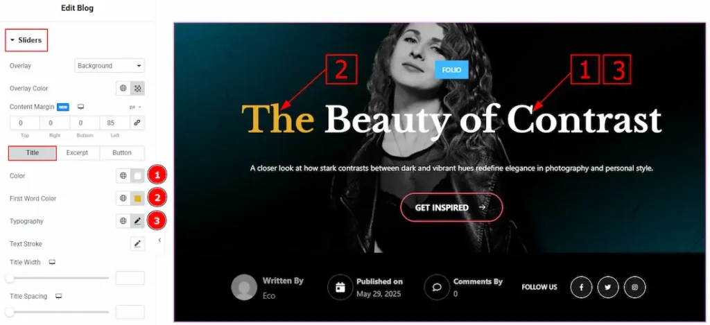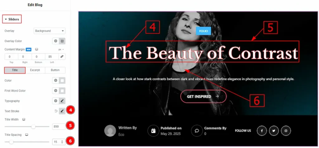 6. Title Spacing: This option allows you to adjust the space and gaps between the title and the excerpt.