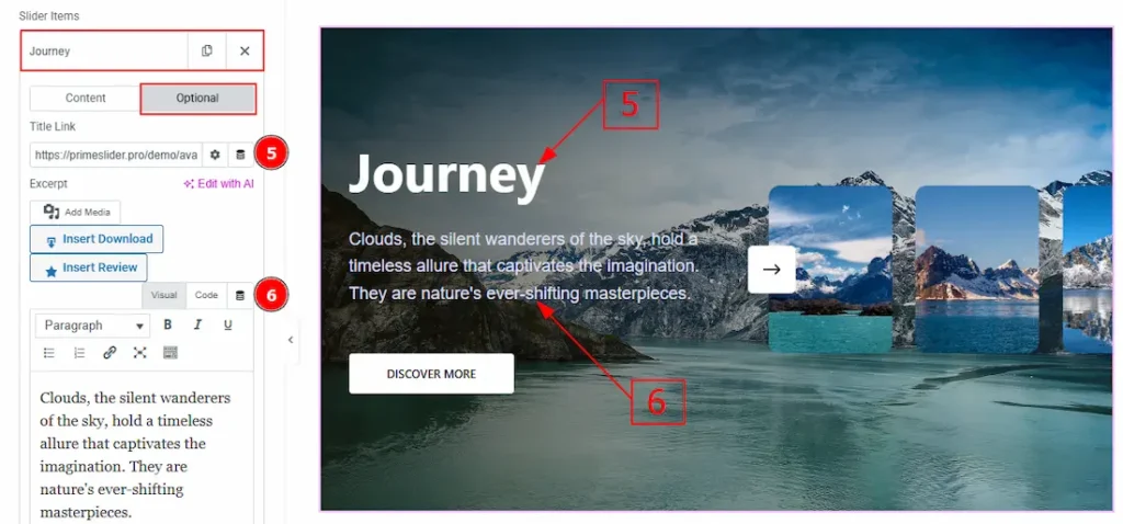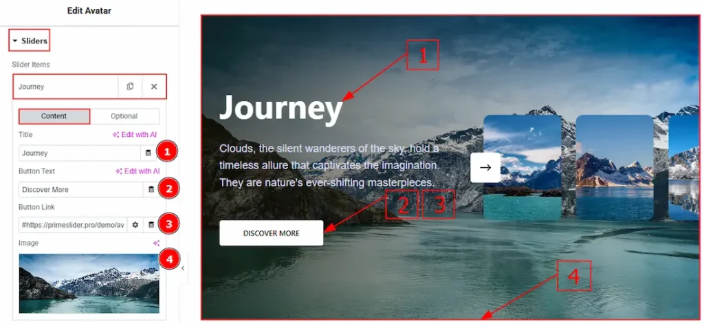 In the Slider Items, each item contains more options. There are two tabs that present those options. These are Content & Optional. Let’s start with the Content Tab –