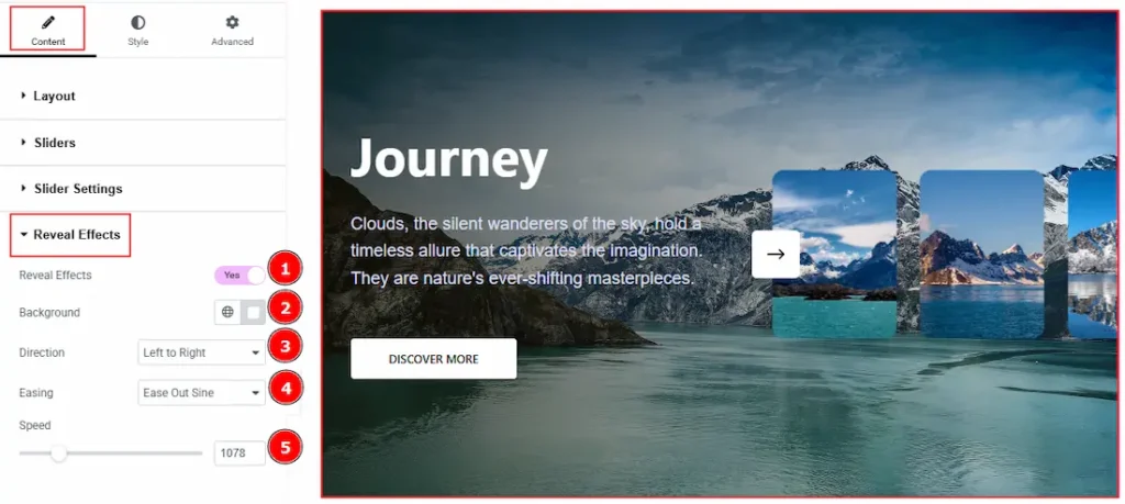 1. Reveal Effect: Enable the switcher to reveal animation on the slider. You will get more options after enabling the switcher.