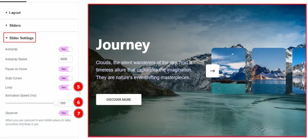 7. Observer: Enabling this option helps the slider function correctly when it’s initially hidden.