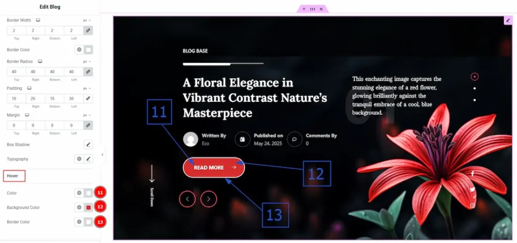 9. Typography: Change the font family, size, weight, transform, style, decoration, line height, letter spacing, and word spacing from here.