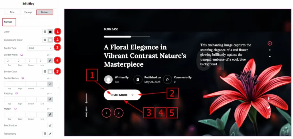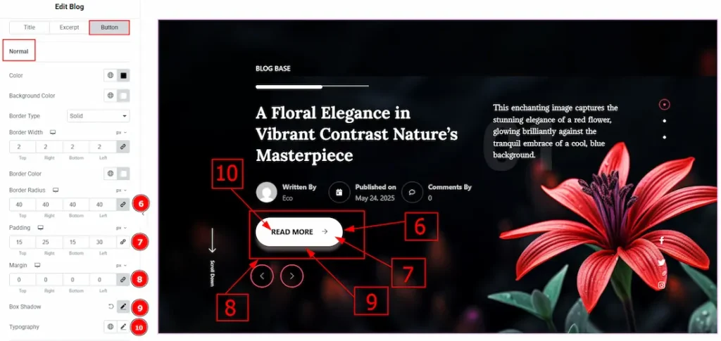 10.Typography: Change the button text font family, size, weight, transform, style, decoration, line height, letter spacing, and word spacing from here.