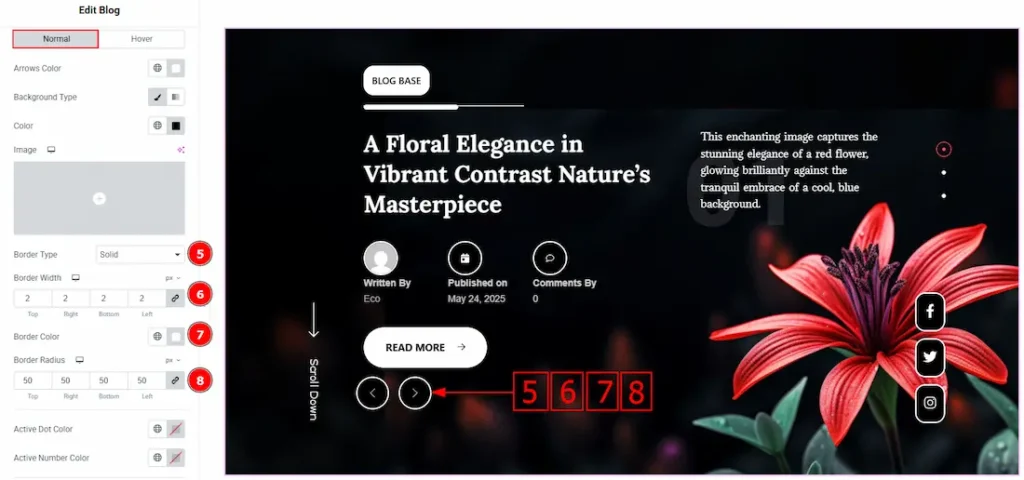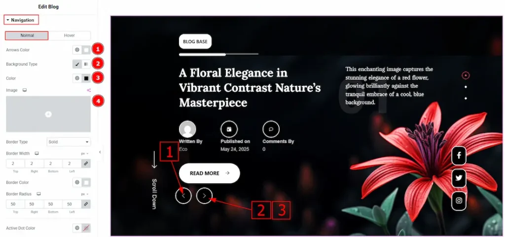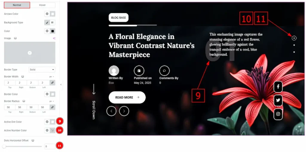 23. Show Dots: Enable or disable the switcher to show or hide the dots from the slider.