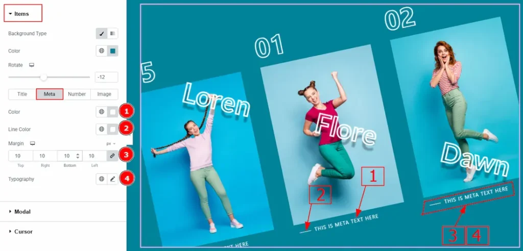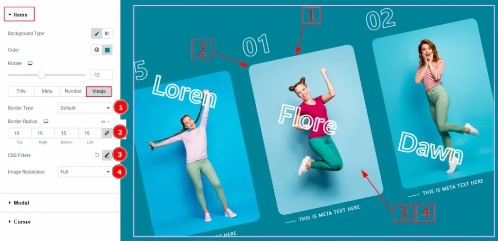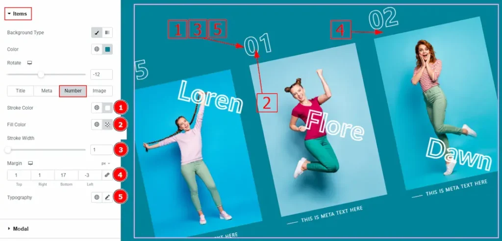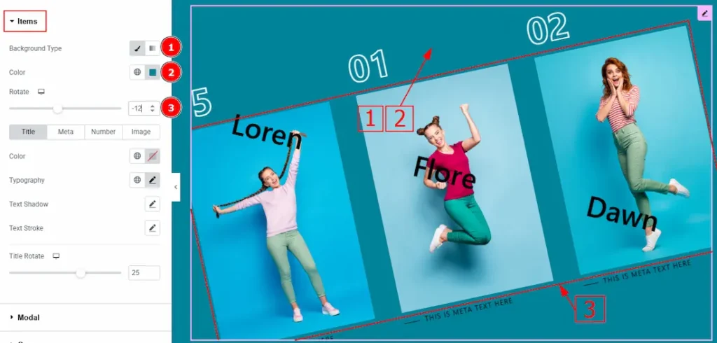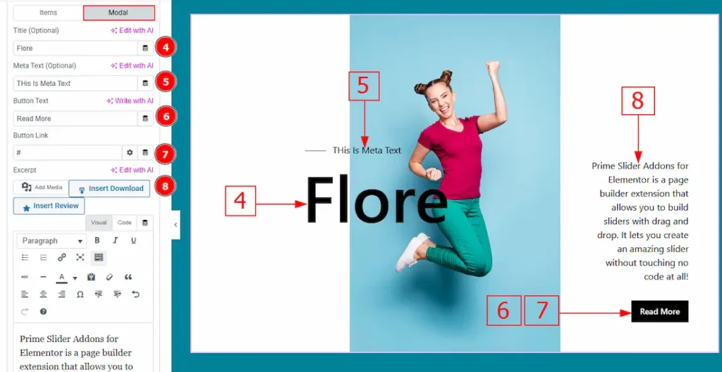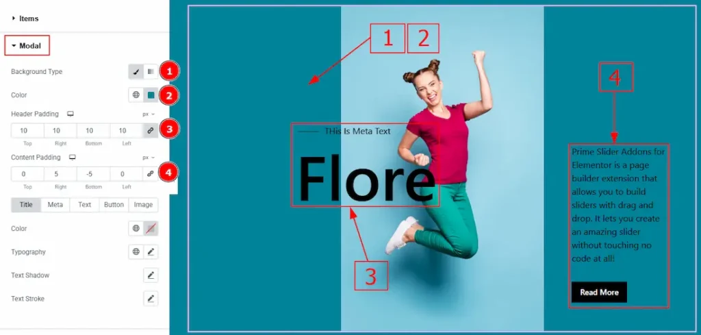 In the Slider Items, each item contains more options. There are two tabs that present those options. These are Items & Modal. Let’s start with the Items Tab –