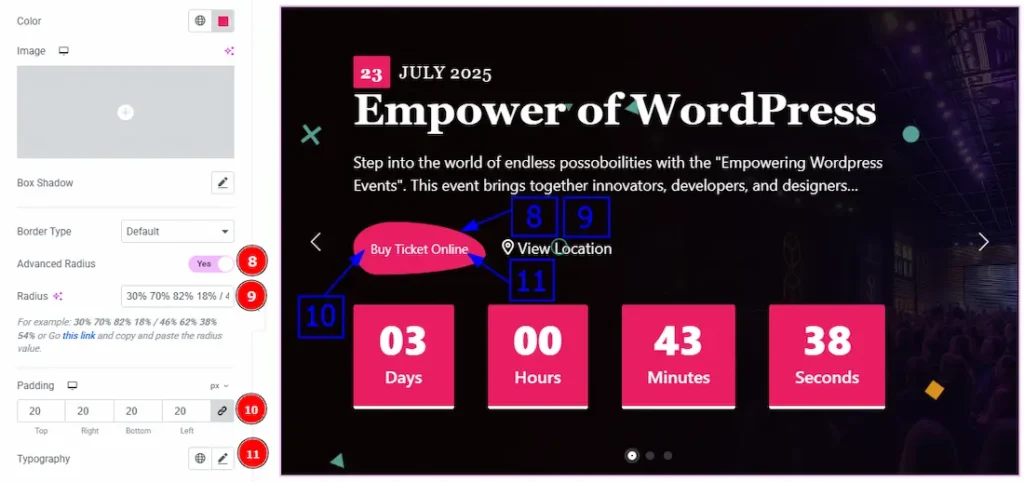 9. Radius: You can customize the border radius with this option.
