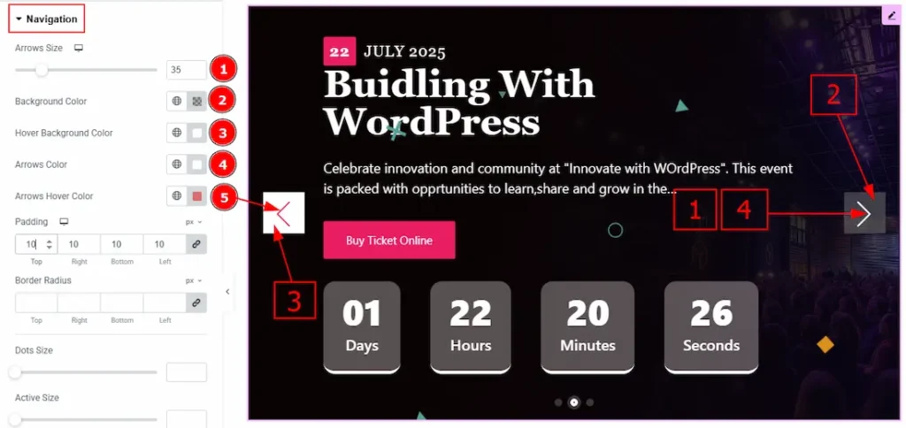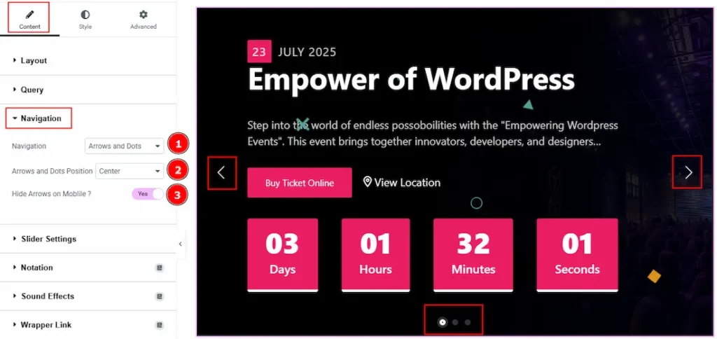 1. Navigation: You can select the navigation type to arrows & Dots, arrows, dots or none with this option. Here, we selected the navigation type as arrows and dots.