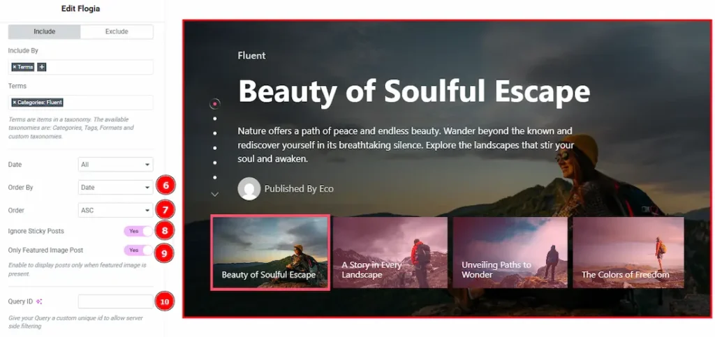 3. Include/Exclude Selection: Select the Include / Exclude filter to show/hide specific posts by Terms (Tags/Categories) or Authors. Here, we selected the include field as Terms.