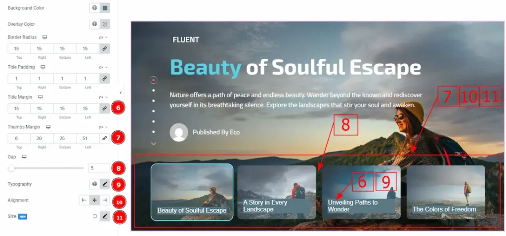 11. Size: You can make changes to the thumbs size by height & width with this option.