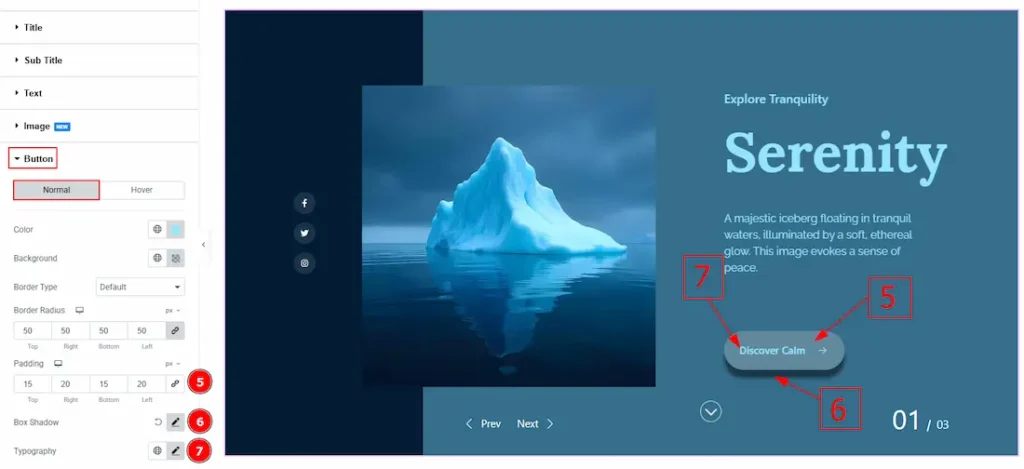 7. Typography: Change the button text font family, size, weight, transform, style, decoration, line height, letter spacing, and word spacing from here.
