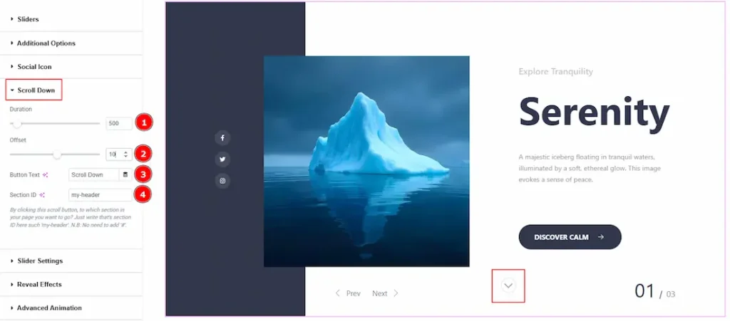 4. Section ID: You can add the section ID here to go to the section where you want to go by clicking on the scroll down button.