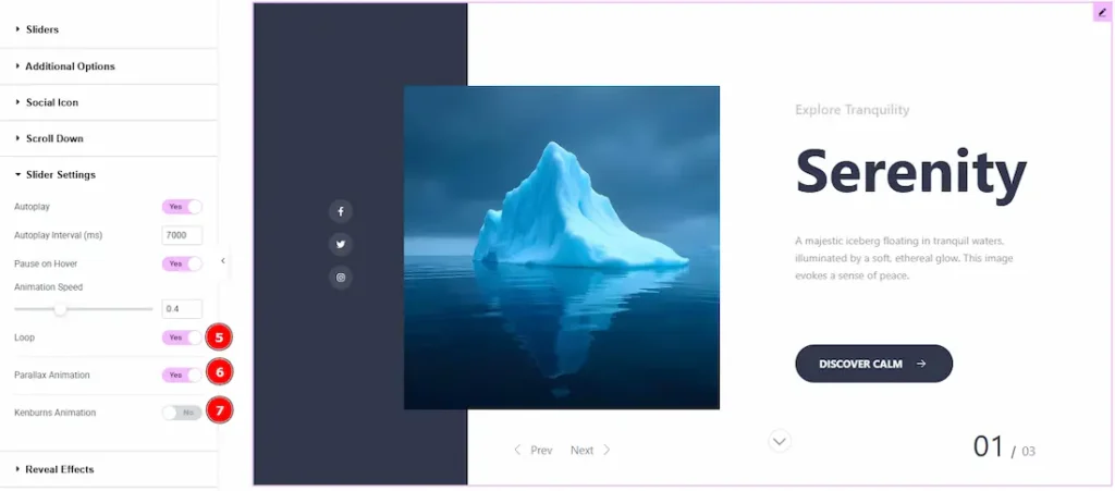 6. Parallax Animation: Enable the switcher to add a layered scrolling effect to slider elements.