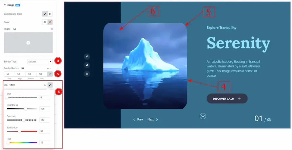 6. CSS Filters: This setting lets you apply visual changes to the image. In this setting you can modify properties like Blur, Brightness, Contrast, Saturation, and Hue.