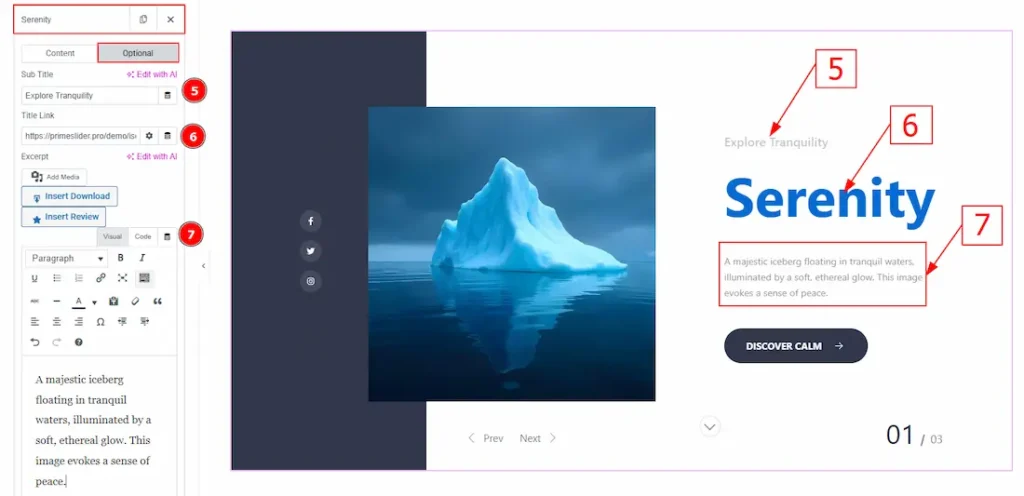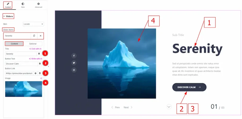 In the Slider Items, each item contains more options. There are two tabs that present those options. These are Content & Optional. Let’s start with the Content Tab –