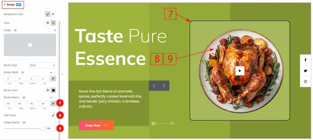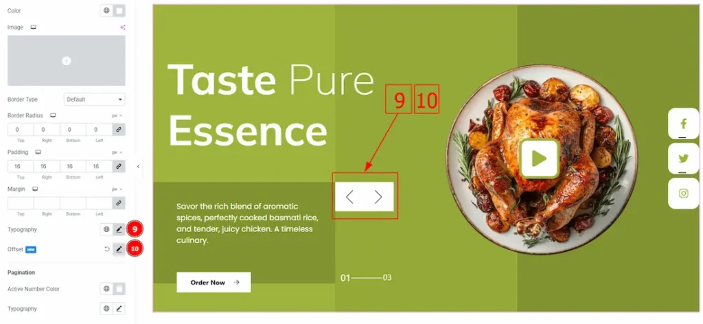 9. Typography: Change the font family, size, weight, transform, style, decoration, line height, letter spacing, and word spacing from here.
