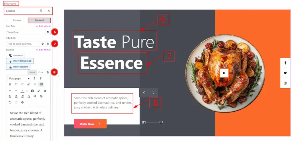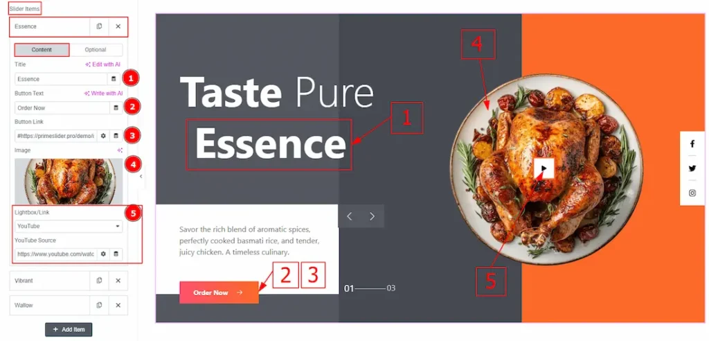 In the Slider Items, each item contains more options. There are two tabs that present those options. These are Content & Optional. Let’s start with the Content Tab –