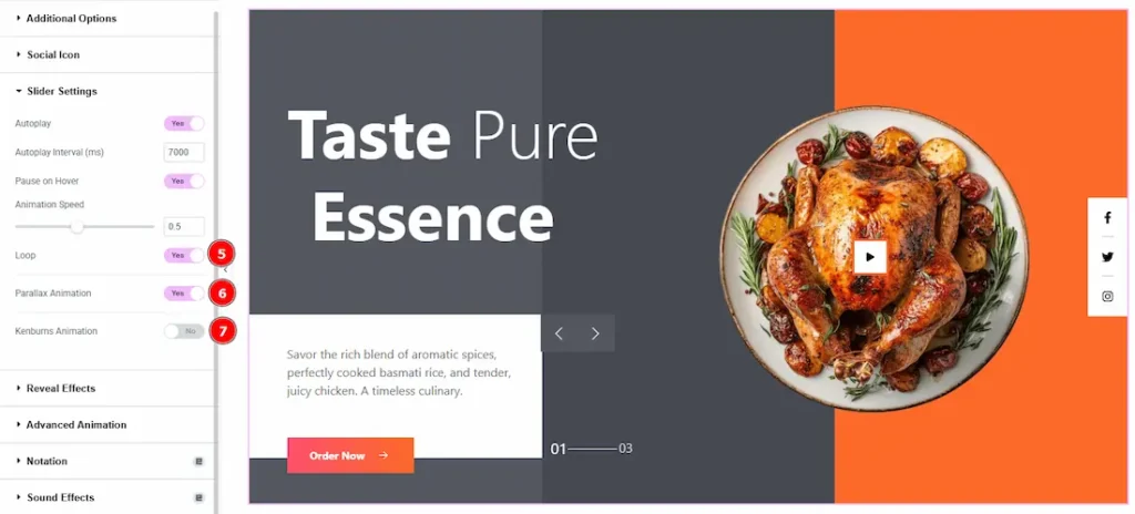 6. Parallax Animation: Enable the switcher to add a layered scrolling effect to slider elements.