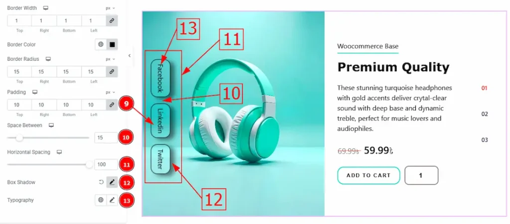 11. Horizontal Spacing: You can move the social share field horizontally with this option.
