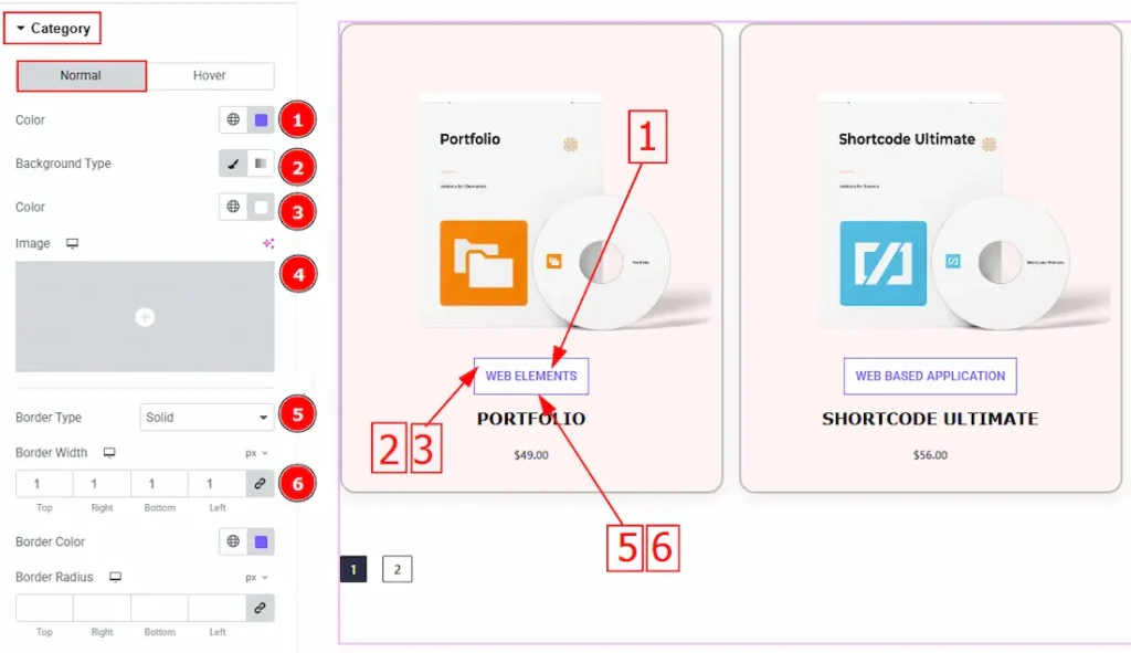 In this section, we have two tabs. One is Normal and the other is Hover. Let’s start with the Normal tab – 1. Color: You can change the category’s color with this option.