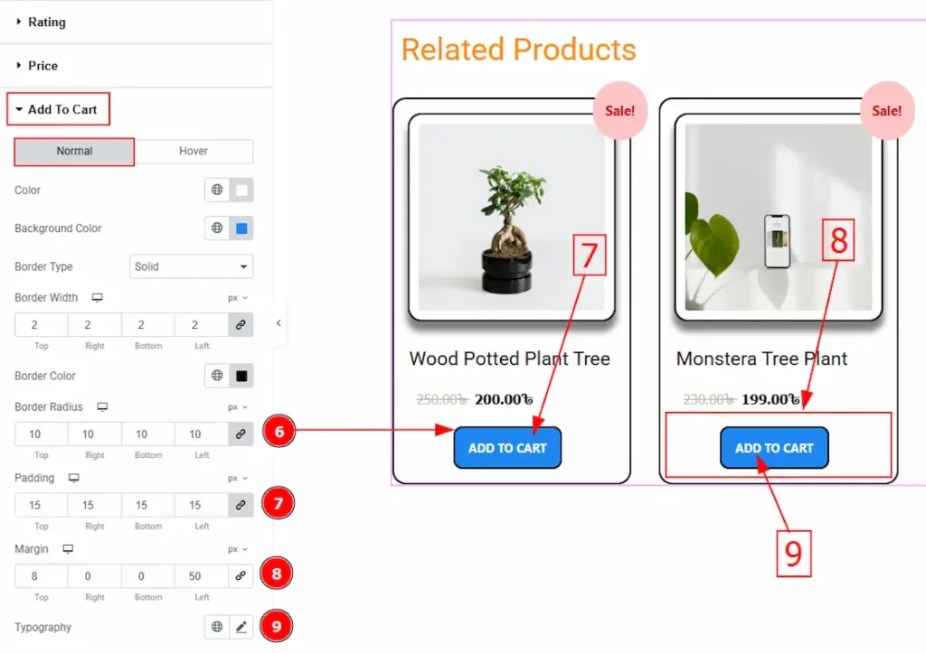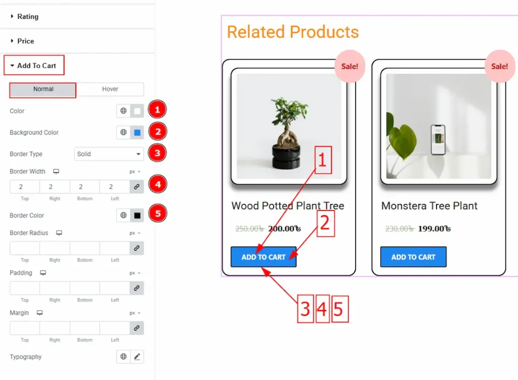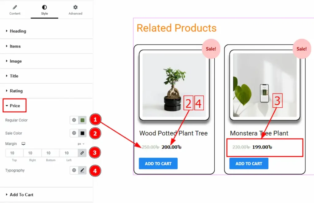 4. Typography: Change the price’s font family, size, weight, transform, style, decoration, line height, letter spacing, and word spacing from here.