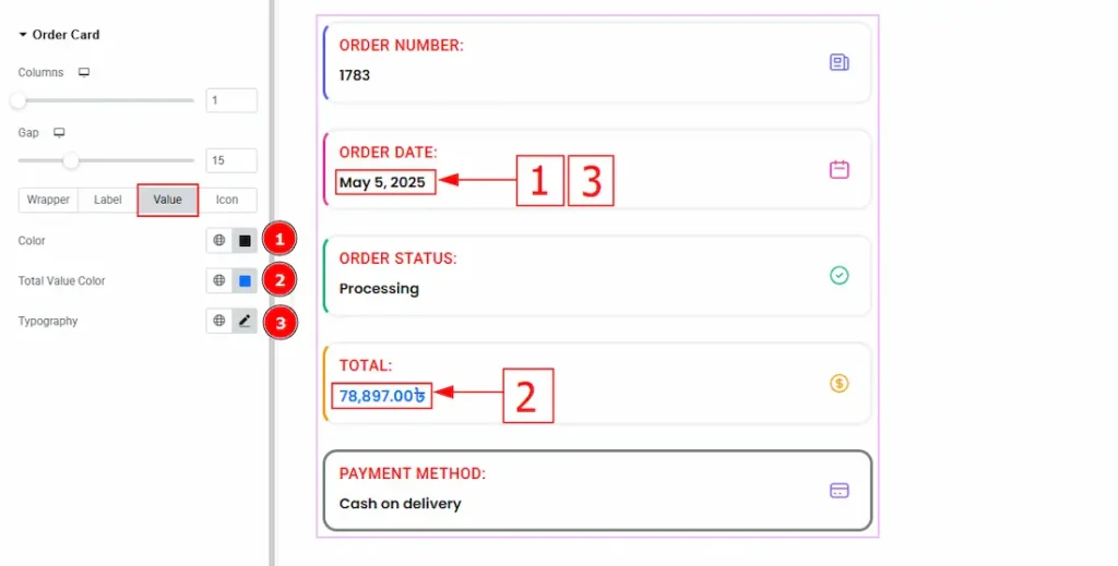 3. Typography: Change the value’s font family, size, weight, transform, style, decoration, line height, letter spacing, and word spacing from here.