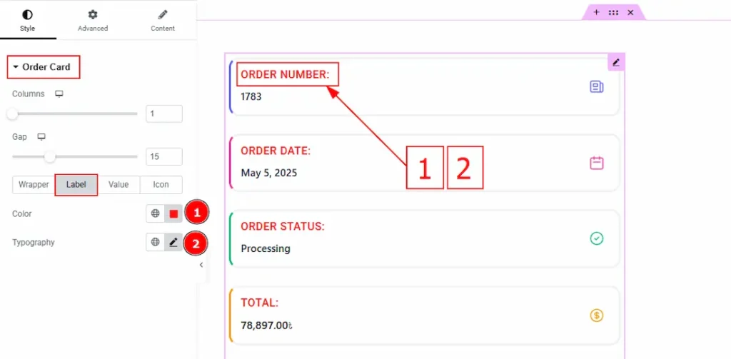 2. Typography: Change the label’s font family, size, weight, transform, style, decoration, line height, letter spacing, and word spacing from here.