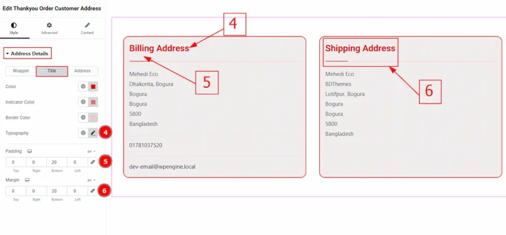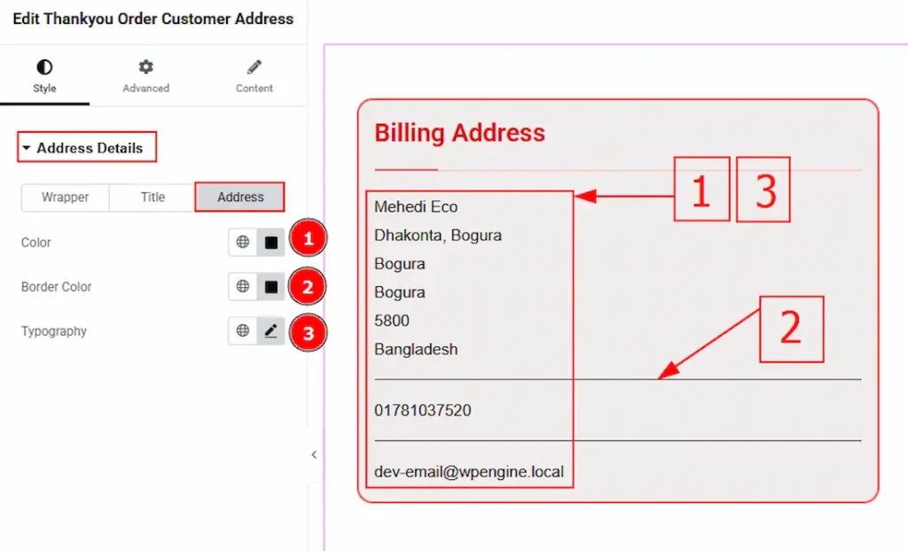 3. Typography: Change the address text’s font family, size, weight, transform, style, decoration, line height, letter spacing, and word spacing from here.