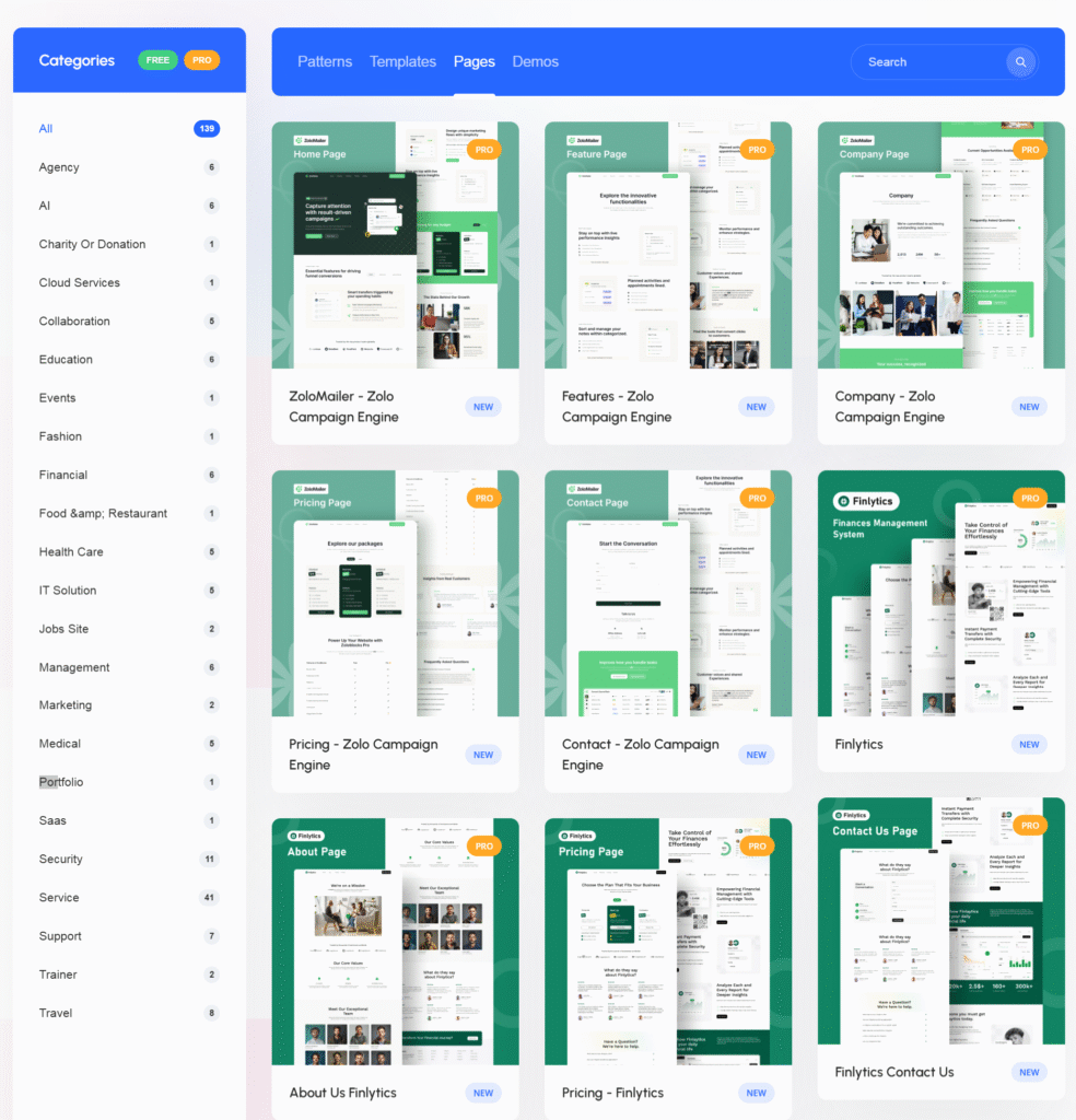 ZoloBlocks comes with a growing collection of pre-designed templates and full-page layouts: